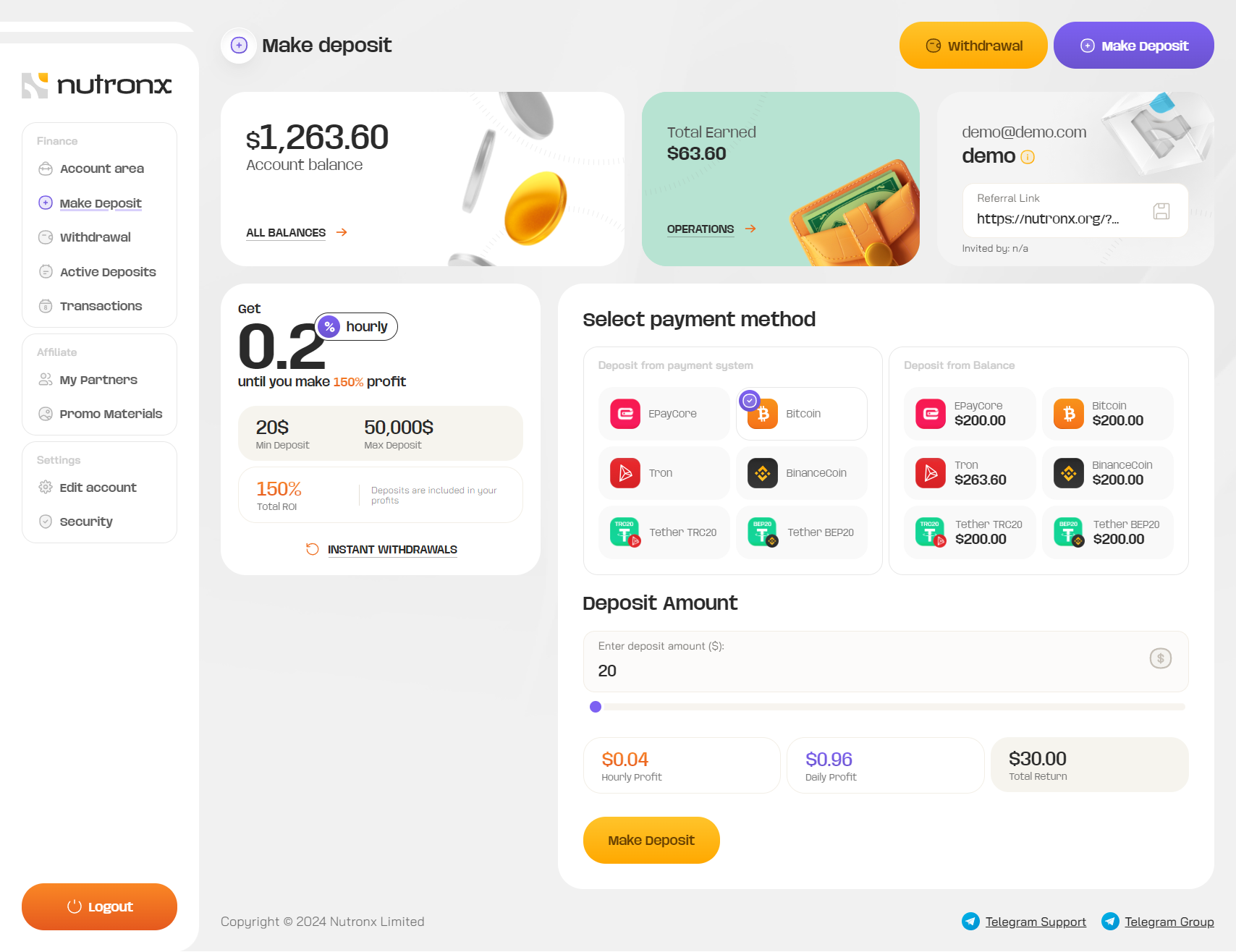 Create AccountLog into your VisualHyipaccount and navigate to the "Deposit" section. Select your preferred payment method from our wide range of options, including ePaycore, Bitcoin, Tron, Binance Coin, and Tether (USDT-TRC20/BEP20).